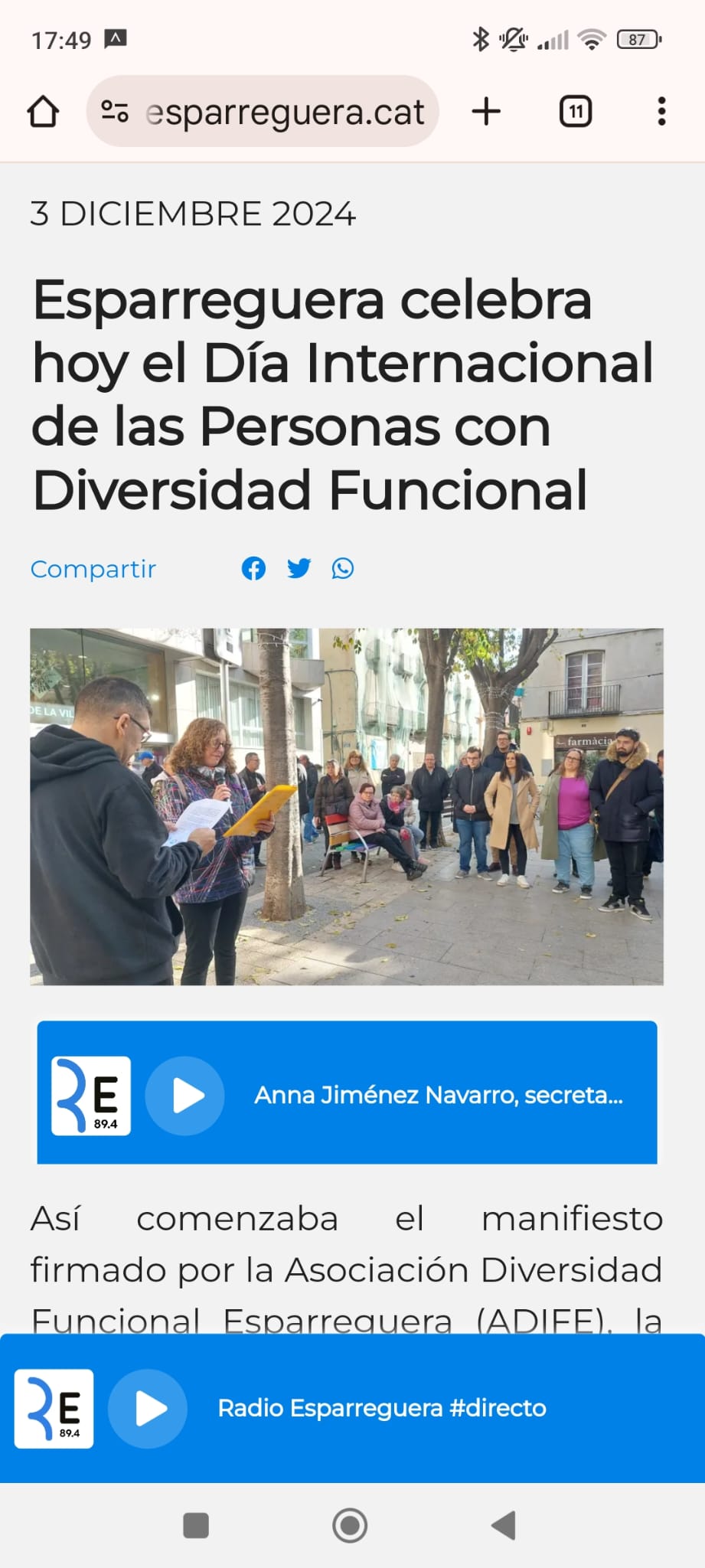EN LA PLAZA DEL AYUNTAMIENTO SE LEIO UN MANIFIESTO DE LA DIVERSIDAD FUNCIONAL , ENTODA ESA SEMANA SE HICIERON VARIOS EVENTOS EN DIFERNTES PARTES DE ESPARREGUERA, UNA DE LAS ACTIVIDADES FUE UNA ENTREVISTA DE VARIAS ENTIDADES POR RADIO ESPARREGUERA EN LA PLAZA DEL AYUNTAMIENTO